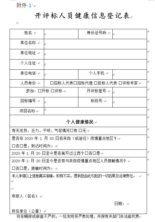 备注:由于疫情尚未解除,请各供应商派一名代表(法定代表人或授权委托人)佩戴好口罩入交易中心中心并携带好本人身份证及加盖单位公章的《开评标人员健康信息登记表》(详见附件 1,请如实填写)接受交易中心人员或代理机构人员入场的检测,否则不准进入。