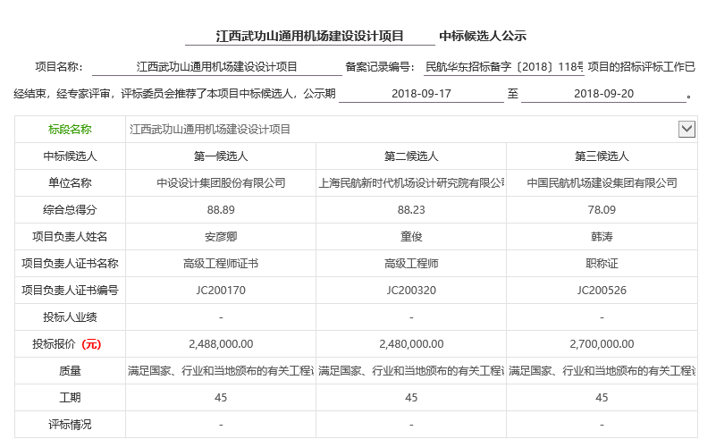 江西武功山通用机场建设设计项目中标候选人公示浏览次数:2166